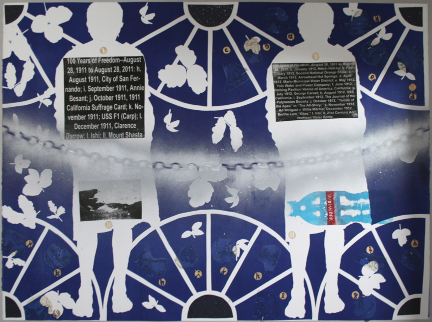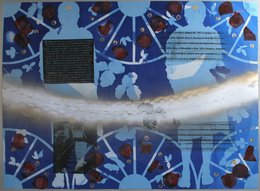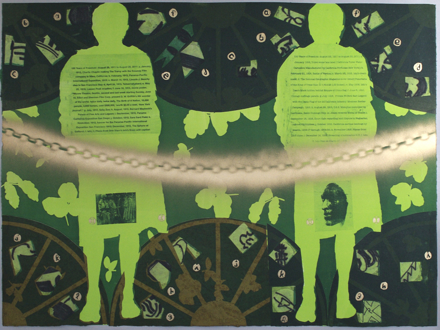 The fourteen monoprints of Erik Bakke's series "100 Years of Freedom" were printed in the summer of 2009 with Smith Andersen Editions, Palo Alto, California. Each print is mixed media on Somerset Satin Radiant White paper of preprint dimensions 35 x 46 3/4 inches.