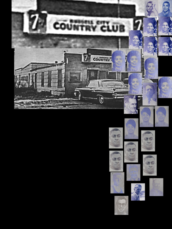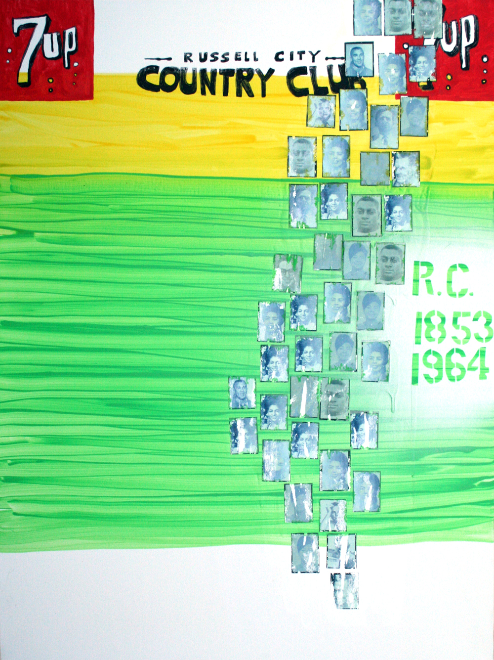 Russell City Country Club, 2012, mixed media on canvas, 40 x 30 inches. Russell City, a part of Hayward, California where African-American WWII industry workers once lived and where blues clubs thrived, is now defunct--taken over through eminent domain in 1964. This painting is one of a series of works about Russell City. It takes its title from a blues club in Russell City where well known blues acts played. Like other clubs in the area, the 7-Up sign was an indicator that music and alcohol could be had inside. The second image is a digital image of the same theme used as a mock-up for the painting |