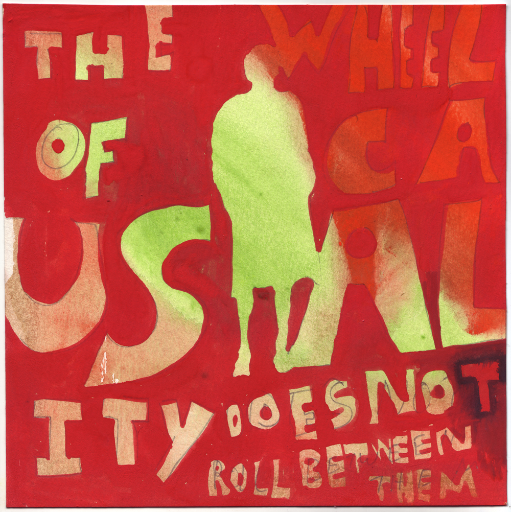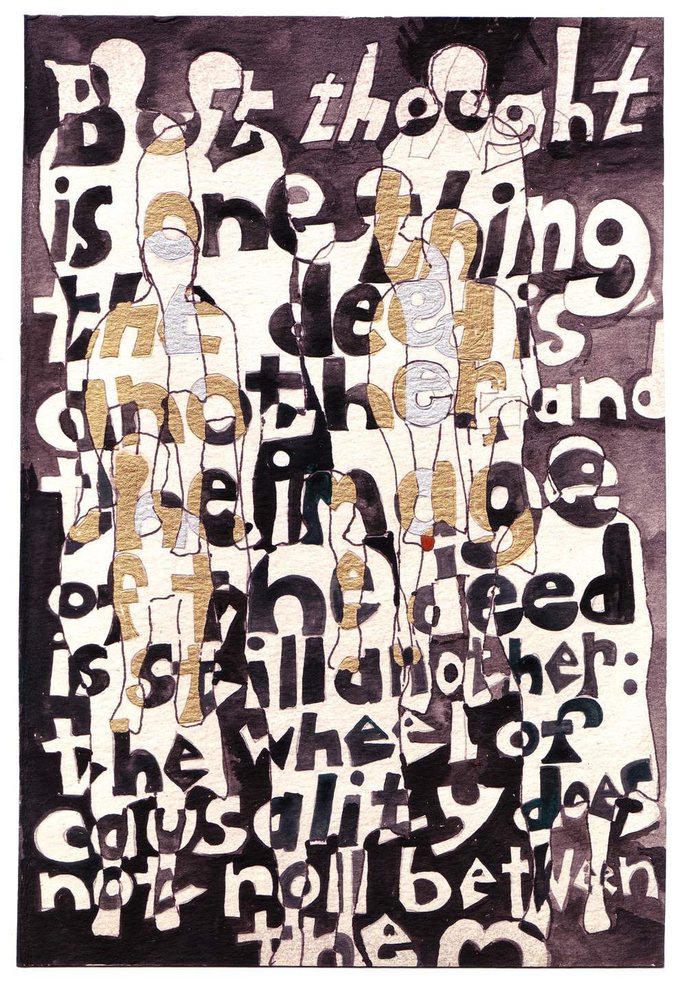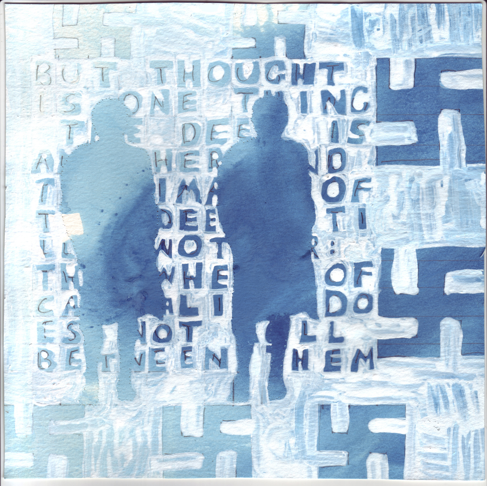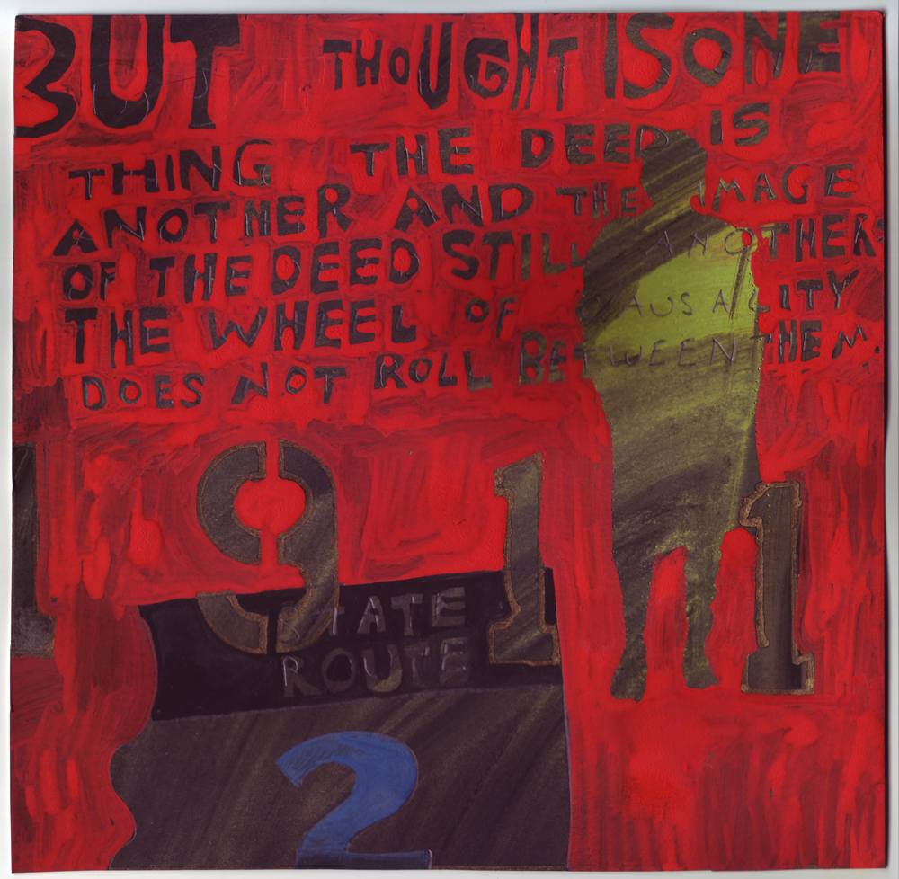 Artist: Erik Bakke Title: 1.7.2011: But thought is one thing, the deed is another, and the image of the deed still another: the wheel of causality does not roll between them. Size: 8 inches x 6 inches |