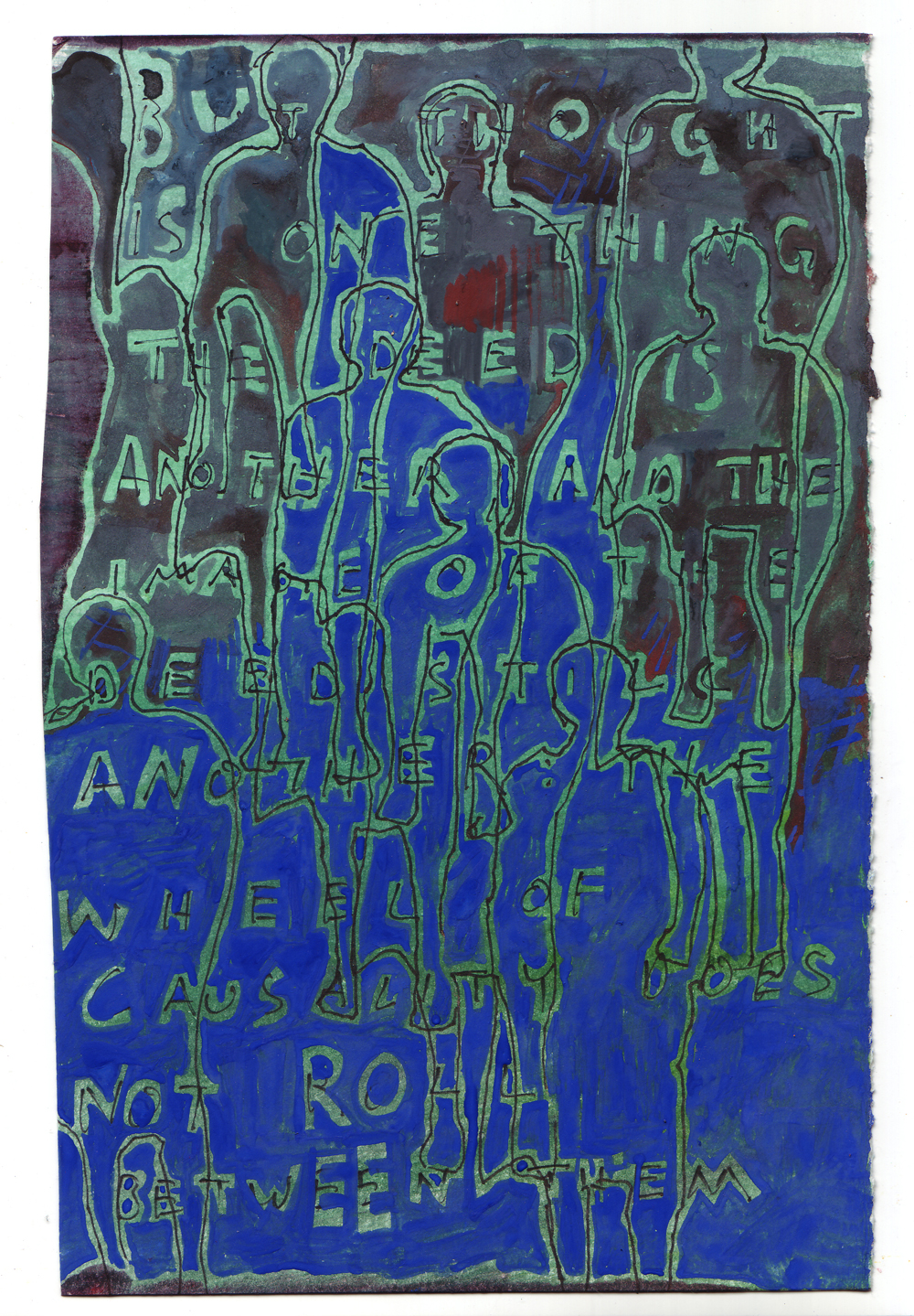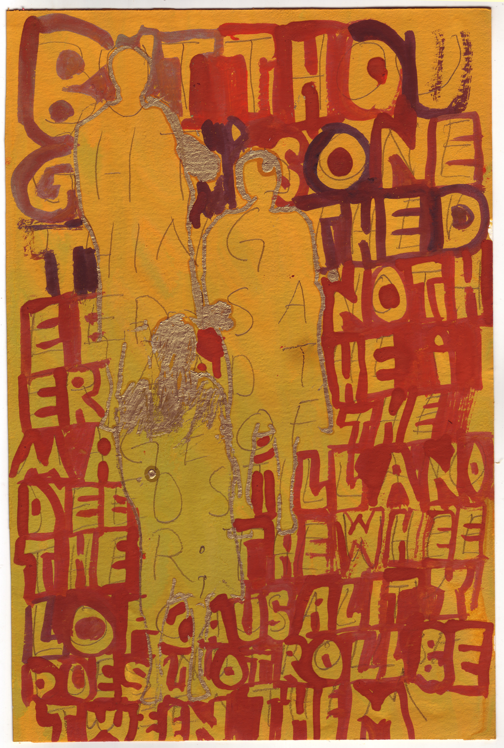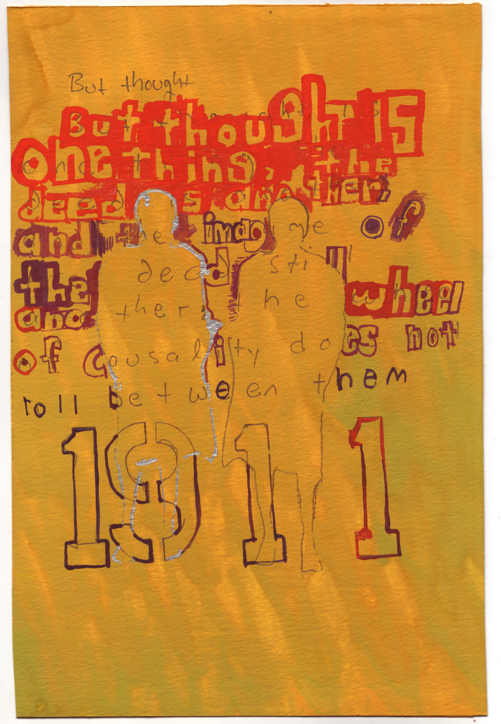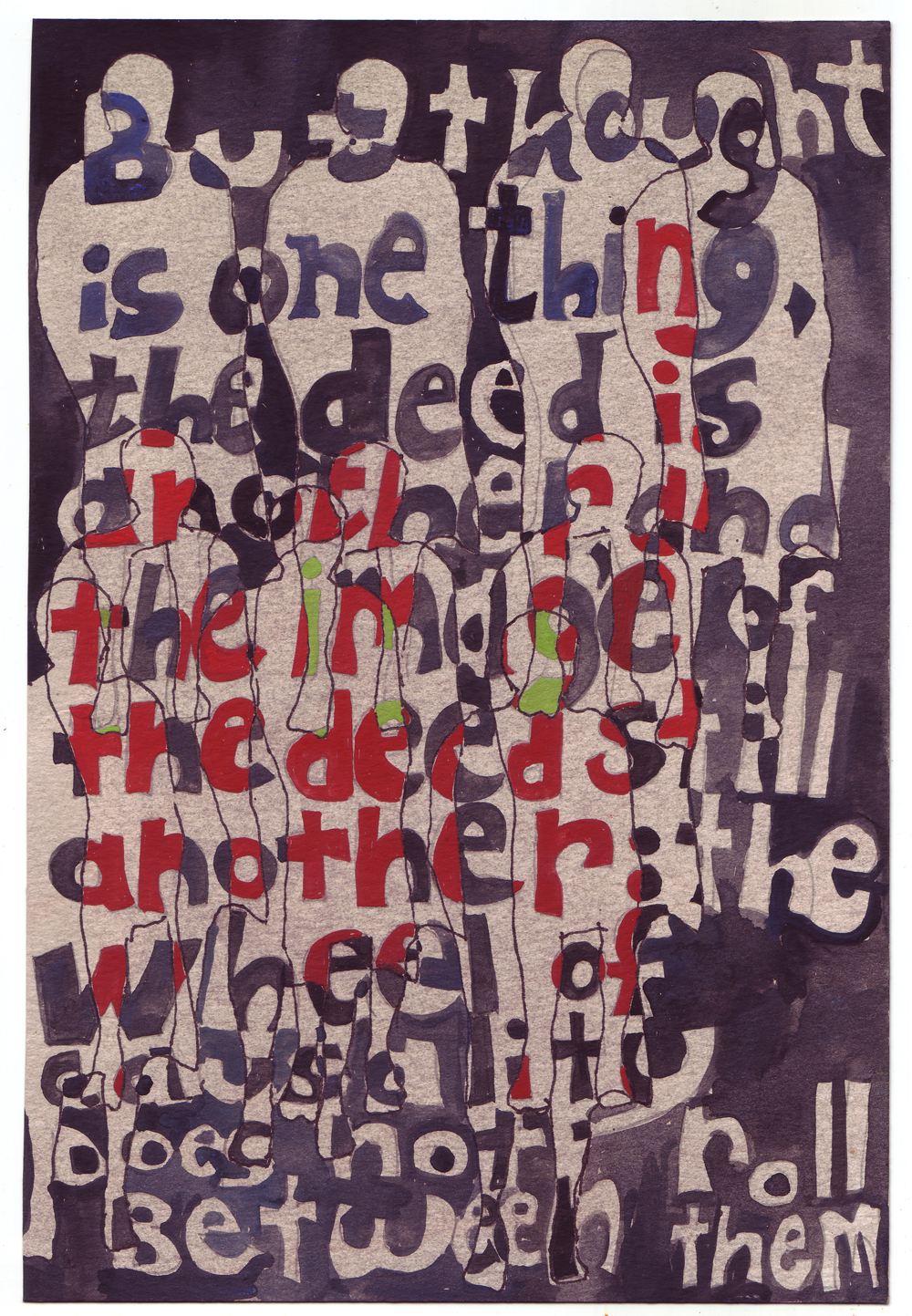 Artist: Erik Bakke Title: 1.7.2011: But thought is one thing, the deed is another, and the image of the deed still another: the wheel of causality does not roll between them. Size: 8 inches x 6 inches |
